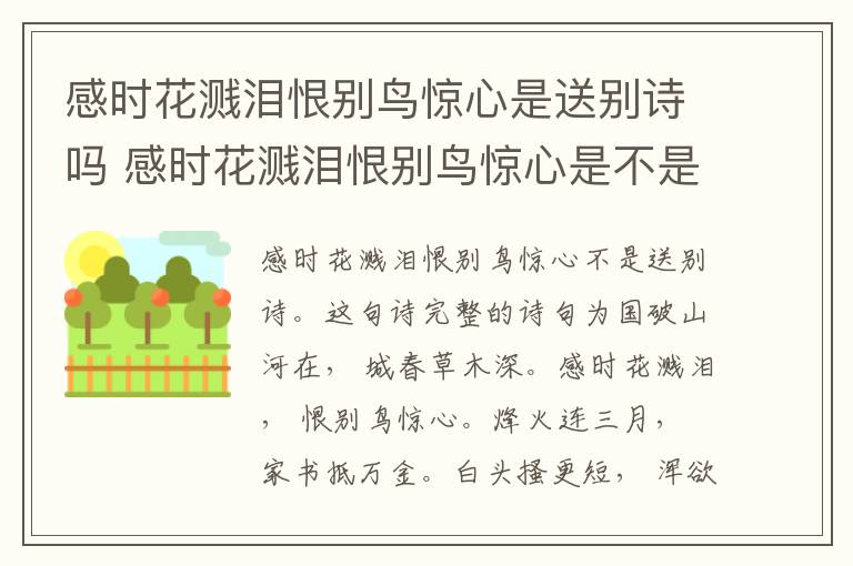 感时花溅泪恨别鸟惊心不是送别诗。这句诗完整的诗句为国破山河在, 城春草木深。感时花溅泪, 恨别鸟惊心。烽火连三月, 家书抵万金。白头搔更短, 浑欲不胜簪。诗的前四句写春城败象,饱含感叹;后四句写心念亲人境况,充溢离情。全诗沉着蕴藉,真挚自然。 这首诗反映了诗人热爱国家、眷念家人的美好情操,意脉贯通而不平直,情景兼具而不游离,感情强烈而不浅露,内容丰富而不芜杂,格律严谨而不板滞,以仄起仄落的五律正格,写得铿然作响,气度浑灏,因而一千二百余年来一直脍炙人口,历久不衰。