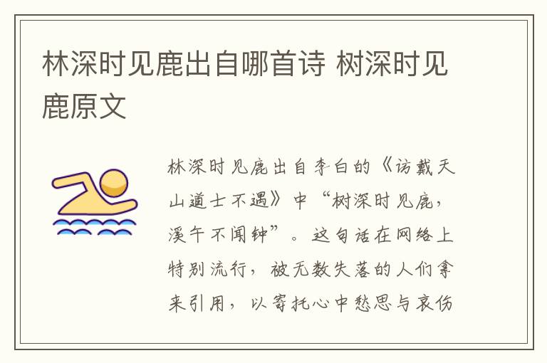 林深时见鹿出自李白的《访戴天山道士不遇》中“树深时见鹿,溪午不闻钟”。这句话在网络上特别流行,被无数失落的人们拿来引用,以寄托心中愁思与哀伤。此诗是李白二十岁以前的作品,风格清丽,充满着年轻人的朝气与孜孜以求的探索精神。