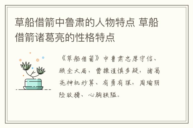 《草船借箭》中鲁肃忠厚守信、顾全大局,曹操谨慎多疑,诸葛亮神机妙算、有勇有谋,周瑜阴险狡猾、心胸狭隘。