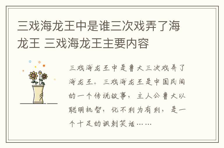三戏海龙王中是鲁大三次戏弄了海龙王。三戏海龙王是中国民间的一个传说故事,主人公鲁大以聪明机智,化不利为有利,是一个十足的讽刺笑话。故事讲述了本就天旱少雨的鲁家村恰逢干旱,龙王却故意为难,鲁大决定使计让龙王布雨,依靠自己的聪明才智三次戏弄海龙王,并且逃避了龙王的报复和捉拿,使得龙王再不敢为难鲁家村,村里的收成也日益好起来。