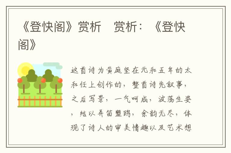 《登快阁》赏析 赏析:《登快阁》 知识分享 23年2月9日 编辑 童画 取消关注 关注 私信 《登快阁》赏析:这首诗为黄庭坚在元和五年的太和任上创作的,整首诗先叙事,之后写景,一气呵成,波荡生姿,结以弄笛盟鸥,余韵无尽,体现了诗人的审美情趣以及艺术想法,登快阁被称为黄庭坚的代表作。 No related posts. 本文内容由互联网用户自发贡献,该文观点仅代表作者本人。本站仅提供信息存储空间服务,不拥有所有权,不承担相关法律责任。如发现本站有涉嫌抄袭侵权/违法违规的内容, 请发送邮件至 2245678901@qq.com 举报,一经查实,本站将立刻删除。 给TA打赏 共{{data.count}}人 人已打赏