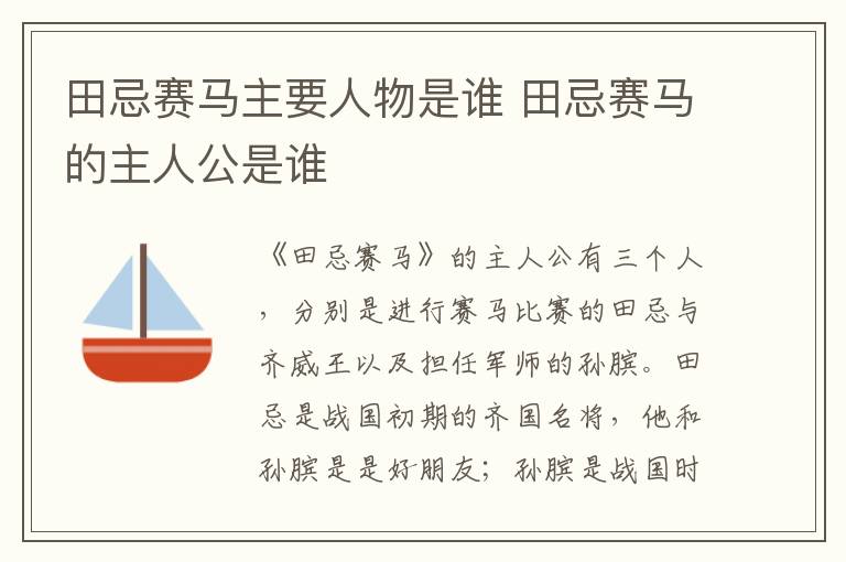 《田忌赛马》的主人公有三个人,分别是进行赛马比赛的田忌与齐威王以及担任军师的孙膑。田忌是战国初期齐国名将,他和孙膑是是好朋友;孙膑是中国战国时期军事家,著有《孙膑兵法》;齐威王是中国战国时期的齐国国君。