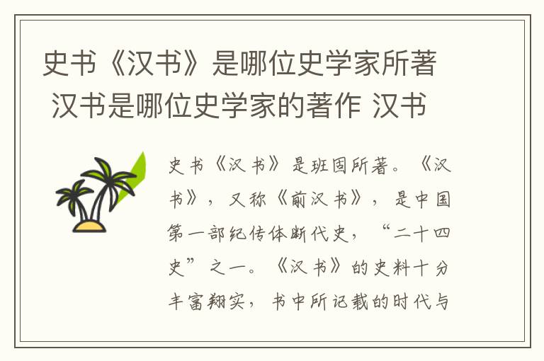 史书《汉书》是班固所著。《汉书》,又称《前汉书》,是中国第一部纪传体断代史,“二十四史”之一。《汉书》的史料十分丰富翔实,书中所记载的时代与《史记》有交叉,在汉武帝中期以前的汉朝历史,两书都有记载。