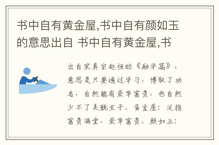 “书中自有黄金屋,书中自有颜如玉”出自宋真宗赵恒的《励学篇》,意思是只要通过学习,博取了功名,自然能有荣华富贵,也自然少不了美貌女子。黄金屋:泛指富贵满堂、荣华富贵。颜如玉:指美貌女子。