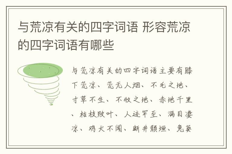 与荒凉有关的四字词语主要有膝下荒凉、荒无人烟、不毛之地、寸草不生、不牧之地、赤地千里、枯枝败叶、人迹罕至、满目凄凉、鸡犬不闻、断井颓垣、兔葵燕麦、蛮烟瘴雾、穷乡僻壤等。荒凉,指的是人烟少、冷清,形容旷野无人的景况。