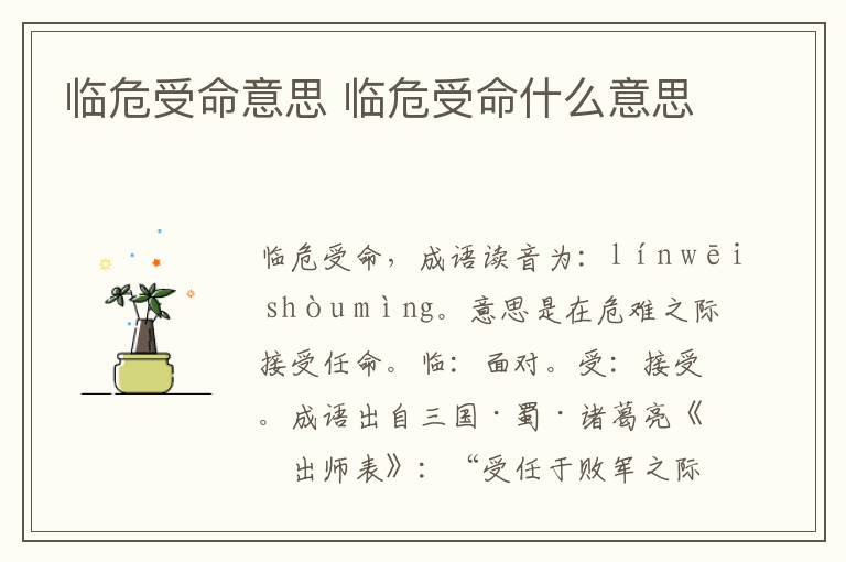 临危受命,成语读音为:lín wēi shòu mìng。意思是在危难之际接受任命。