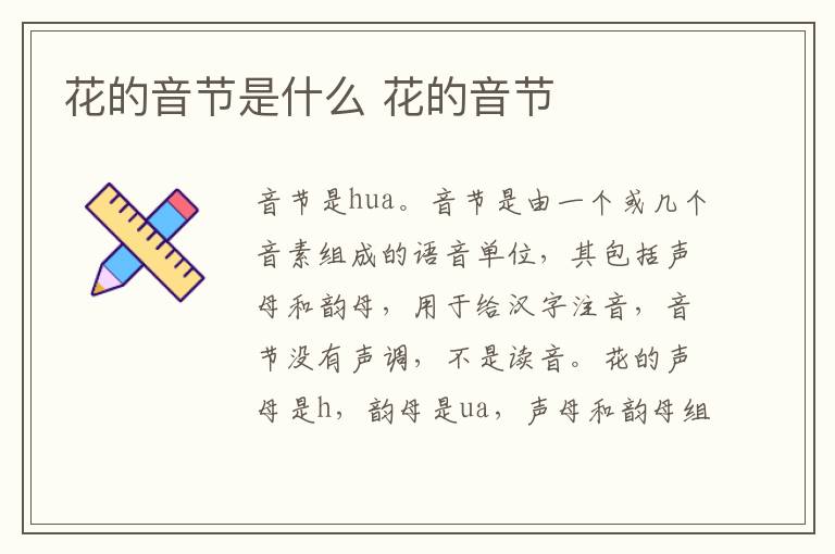 花的音节是hua。音节是由一个或几个音素组成的语音单位,其包括声母和韵母,用于给汉字注音,音节没有声调,不是读音。花的声母是h,韵母是ua,声母和韵母组成花的完整音节hua。所以,花的音节是hua。