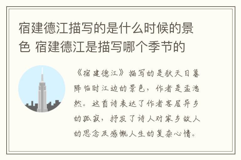 《宿建德江》描写的是秋天日暮降临时江边的景色,作者是孟浩然。这首诗表达了作者客居异乡的孤寂,抒发了诗人对家乡故人的思念及感慨人生的复杂心情。