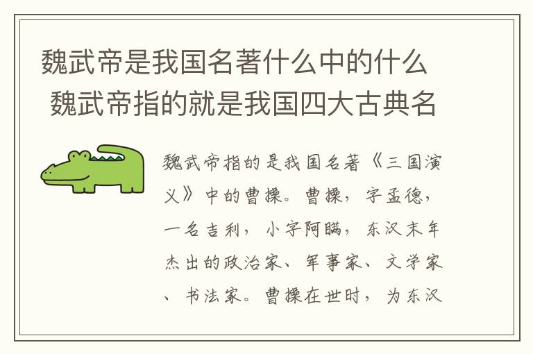 魏武帝指的是我国名著《三国演义》中的曹操。曹操,字孟德,一名吉利,小字阿瞒,东汉末年杰出的政治家、军事家、文学家、书法家。曹操在世时,为东汉丞相,后为魏王,其子曹丕称帝后,追尊为武帝。