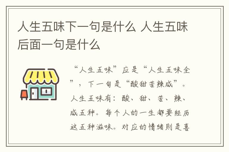 “人生五味”应是“人生五味全”,下一句是“酸甜苦辣咸”。人生五味有:酸、甜、苦、辣、咸五种。每个人的一生都要经历这五种滋味。对应的情绪则是喜、怒、哀、乐、怨。对于五味,嗜好其中任何一种,都是一种偏执。人生的一切烦恼都是由这种偏执产生。