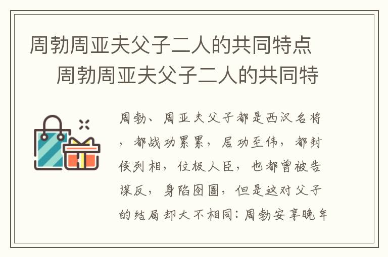 周勃、周亚夫父子都是西汉名将,都战功累累,居功至伟,都封侯列相,位极人臣,也都曾被告谋反,身陷囹圄,但是这对父子的结局却大不相同:周勃安享晚年,得以善终,周亚夫含冤入狱,活活饿死。常言道,性格决定命运,周氏父子相同的血脉,相近的能力,相似的官场经历,却是不同的人生归宿,这也都是性格决定的。