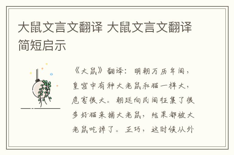 《大鼠》翻译:明朝万历年间,皇宫中有种大老鼠和猫一样大,危害很大。朝廷向民间征集了很多好猫来捕大老鼠,结果都被大老鼠吃掉了。正巧,这时候从外国进贡来一只狮猫。这只狮猫全身毛白如雪。太监把这只猫抱到有大老鼠的房子里,关上门,然后从门缝里悄悄偷看猫的动静。狮猫蹲了好久,那大老鼠才从洞穴里探头探脑地出来。它一见狮猫,就发怒地扑过来。