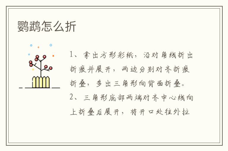 鹦鹉怎么折 知识分享 23年2月9日 编辑 童画 取消关注 关注 私信 1、拿出方形彩纸,沿对角线折出折痕并展开,两边分别对齐折痕折叠,多出三角形向背面折叠。 2、三角形底部两端对齐中心线向上折叠后展开,将开口处往外拉开并压平,上下两部分都是统一折法。 3、两个三角再向左折叠,尖角处分层折叠。 4、对折后,将头部折叠并收折进去,这样鹦鹉就折好了。 No related posts. 本文内容由互联网用户自发贡献,该文观点仅代表作者本人。本站仅提供信息存储空间服务,不拥有所有权,不承担相关法律责任。如发现本站有涉嫌抄袭侵权/违法违规的内容, 请发送邮件至 2245678901@qq.com 举报,一经查实,本站将立刻删除。 给TA打赏 共{{data.count}}人 人已打赏