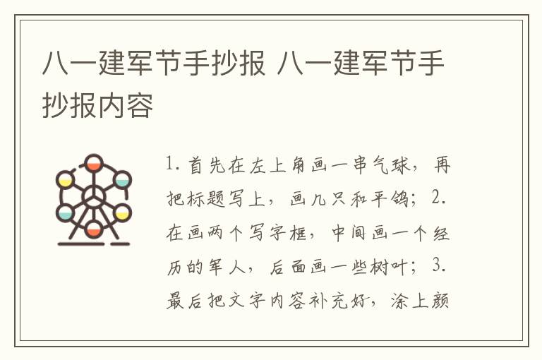 八一建军节手抄报 八一建军节手抄报内容 知识分享 23年2月9日 编辑 童画 取消关注 关注 私信 1.首先在左上角画一串气球,再把标题写上,画几只和平鸽; 2.在画两个写字框,中间画一个经历的军人,后面画一些树叶; 3.最后把文字内容补充好,涂上颜色就完成了。 No related posts. 本文内容由互联网用户自发贡献,该文观点仅代表作者本人。本站仅提供信息存储空间服务,不拥有所有权,不承担相关法律责任。如发现本站有涉嫌抄袭侵权/违法违规的内容, 请发送邮件至 2245678901@qq.com 举报,一经查实,本站将立刻删除。 给TA打赏 共{{data.count}}人 人已打赏