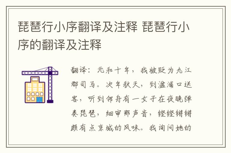 元和十年,予左迁九江郡司马。明年秋,送客湓浦口,闻舟中夜弹琵琶者,听其音,铮铮然有京都声。问其人,本长安倡女,尝学琵琶于穆、曹二善才,年长色衰,委身为贾人妇。遂命酒,使快弹数曲。曲罢悯然,自叙少小时欢乐事,今漂沦憔悴,转徙于江湖间。予出官二年,恬然自安,感斯人言,是夕始觉有迁谪意。因为长句,歌以赠之,凡六百一十二言,命曰《琵琶行》。