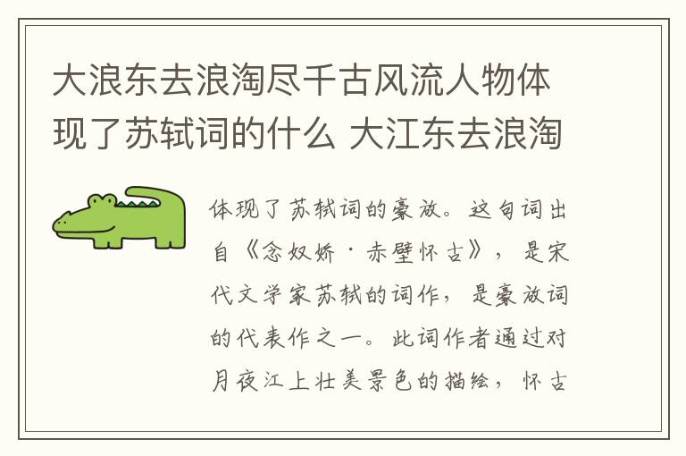 体现了苏轼词的豪放。这句词出自《念奴娇·赤壁怀古》,是宋代文学家苏轼的词作,是豪放词的代表作之一。此词作者通过对月夜江上壮美景色的描绘,怀古抒情,写自己消磨壮心殆尽,转而以旷达之心关注历史和人生。