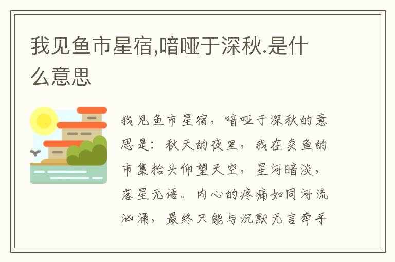 我见鱼市星宿,喑哑于深秋的意思是:秋天的夜里,我在卖鱼的市集抬头仰望天空,星河暗淡,落星无语。内心的疼痛如同河流汹涌,最终只能与沉默无言牵手。久居闹市,身在高楼,霓虹灯彻夜闪烁,炫得人眼花头昏。