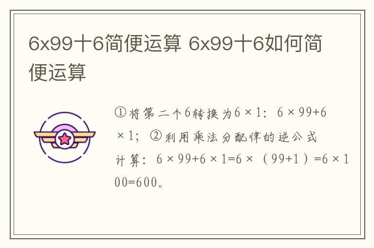 ②利用乘法分配律的逆公式计算:6×99+6×1=6×(99+1)=6×100=600。