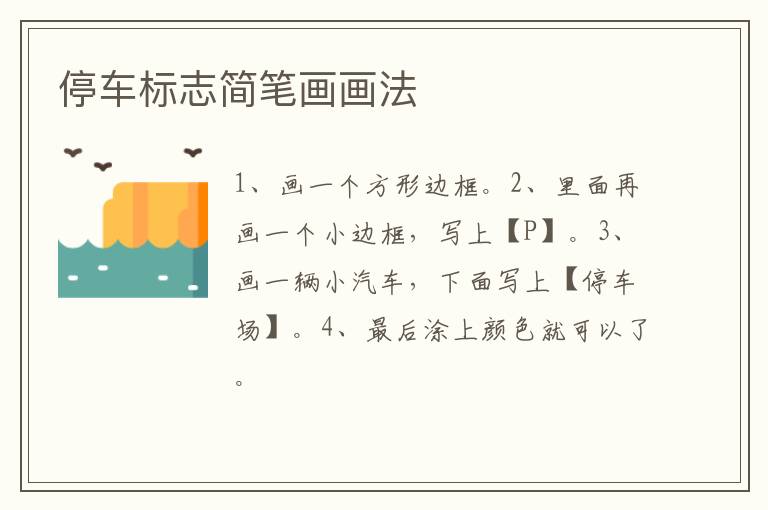 停车标志简笔画画法 知识分享 23年2月9日 编辑 童画 取消关注 关注 私信 1、画一个方形边框。 2、里面再画一个小边框,写上【P】。 3、画一辆小汽车,下面写上【停车场】。 4、最后涂上颜色就可以了。 No related posts. 本文内容由互联网用户自发贡献,该文观点仅代表作者本人。本站仅提供信息存储空间服务,不拥有所有权,不承担相关法律责任。如发现本站有涉嫌抄袭侵权/违法违规的内容, 请发送邮件至 2245678901@qq.com 举报,一经查实,本站将立刻删除。 给TA打赏 共{{data.count}}人 人已打赏