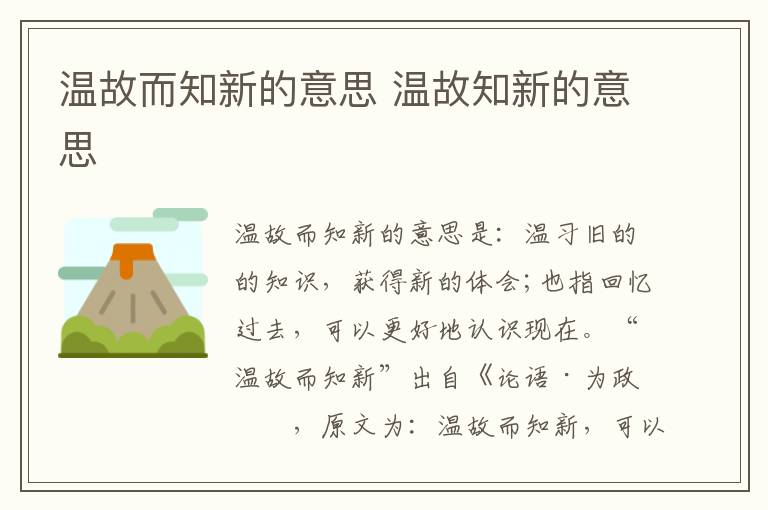 温故而知新的意思是:温习旧的的知识,获得新的体会;也指回忆过去,可以更好地认识现在。“温故而知新”出自《论语·为政》,原文为:温故而知新,可以为师矣。