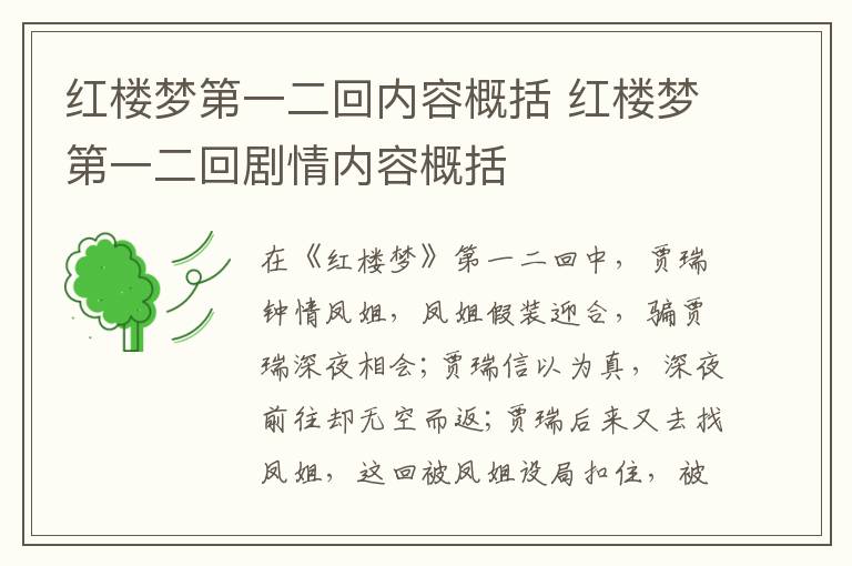 在《红楼梦》第一二回中,贾瑞钟情凤姐,凤姐假装迎合,骗贾瑞深夜相会;贾瑞信以为真,深夜前往却无空而返;贾瑞后来又去找凤姐,这回被凤姐设局扣住,被贾蔷、贾蓉勒索,又被粪尿泼身,回家后病重,收了跛足道人的“风月宝鉴”后,却偏看正面,最后一命呜呼。贾琏送黛玉回扬州看望病重的父亲。