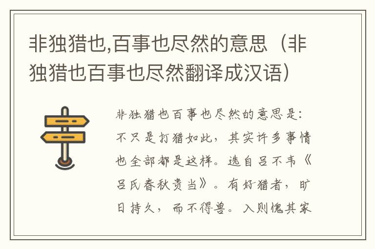 非独猎也百事也尽然的意思是:不只是打猎如此,其实许多事情也全部都是这样。选自吕不韦《吕氏春秋贵当》。有好猎者,旷日持久,而不得兽。入则愧其家室,出则愧其知友乡里,唯其所以不得之故,则狗恶也。欲得良狗,则家贫无以。
