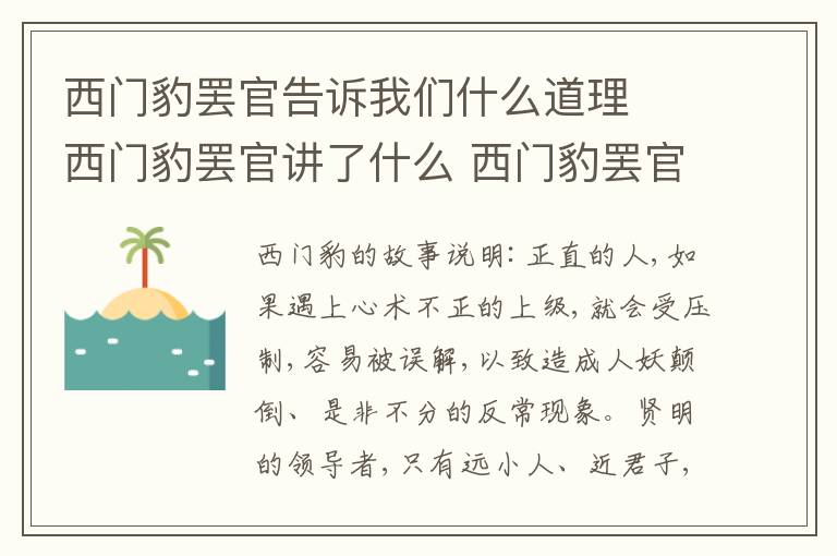 西门豹的故事说明:正直的人,如果遇上心术不正的上级,就会受压制,容易被误解,以致造成人妖颠倒、是非不分的反常现象。贤明的领导者,只有远小人、近君子,才能减少赏罚不明的失误。西门豹,是战国初期魏国人,魏文侯时任邺令初到邺城(今河北临漳县、河南安阳市一带)时,看到这里人烟稀少,田地荒芜萧条,一片冷清,百业待兴,于是立志改善现状。