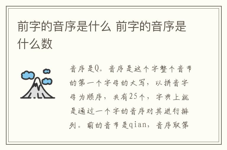 前字的音序是什么 前字的音序是什么数 知识分享 23年2月10日 编辑 童画 取消关注 关注 私信 前字的音序是Q。 音序是这个字整个音节的第一个字母的大写,以拼音字母为顺序,共有25个,字典上就是通过一个字的音序对其进行排列。前的音节是qian,音序取第一个字母的大写字母,即Q。 No related posts. 本文内容由互联网用户自发贡献,该文观点仅代表作者本人。本站仅提供信息存储空间服务,不拥有所有权,不承担相关法律责任。如发现本站有涉嫌抄袭侵权/违法违规的内容, 请发送邮件至 2245678901@qq.com 举报,一经查实,本站将立刻删除。 给TA打赏 共{{data.count}}人 人已打赏