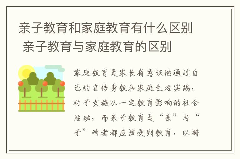家庭教育是家长有意识地通过自己的言传身教和家庭生活实践,对子女施以一定教育影响的社会活动,而亲子教育是“亲”与“子”两者都应该受到教育,以游戏活动作为主要教育手段,使孩子得到良好的发展,使家长成为合格的教育者。