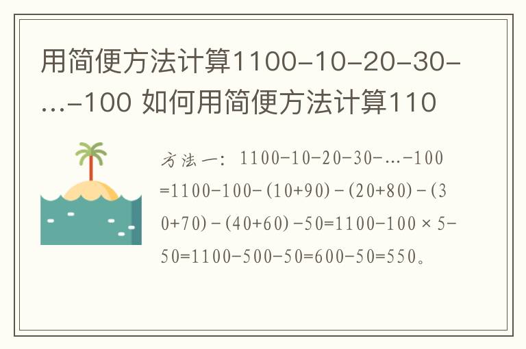 方法二:1100-10-20-30-…-100=1100-(10+100)-(20+90)-(30+80)-(40+70)-(50+60)=1100-110×5=1100-550=550。