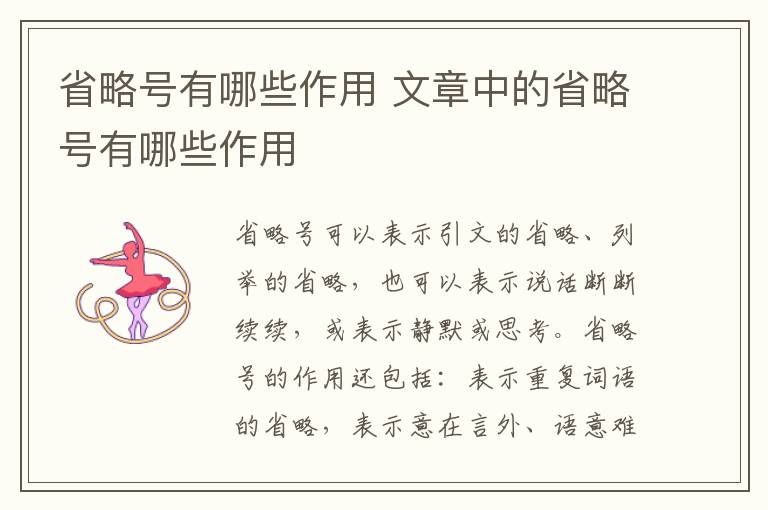 省略号可以表示引文的省略、列举的省略,也可以表示说话断断续续,或表示静默或思考。省略号的作用还包括:表示重复词语的省略,表示意在言外、语意难尽、含糊其辞、语音延长、话未说完、数字的延续等。