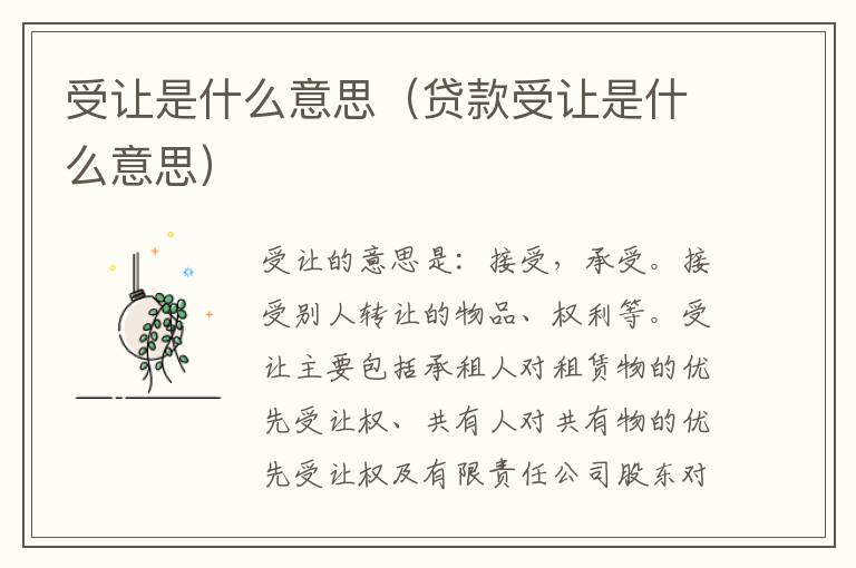 受让的意思是:接受,承受。接受别人转让的物品、权利等。受让主要包括承租人对租赁物的优先受让权、共有人对共有物的优先受让权及有限责任公司股东对其他股东欲转让股份的优先受让权。