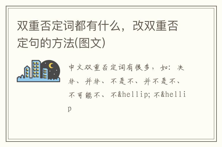 中文双重否定词有很多,如:决非、并非、不是不、并不是不、不可能不、不…不…、没有…不…、非…不…、非……不可…、无不、无非、不无、未必不...不得不、不能不、不会不、不可不等。