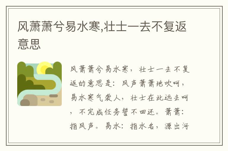 风萧萧兮易水寒,壮士一去不复返的意思是:风声萧萧地吹呵,易水寒气袭人,壮士在此远去呵,不完成任务誓不回还。萧萧:指风声。易水:指水名,源出河北省易县,是当时燕国的南界。壮士:在这里指荆轲。这句诗出自先秦佚名的《荆轲歌》,后两句为:探虎穴兮入蛟宫,仰天呼气兮成白虹。
