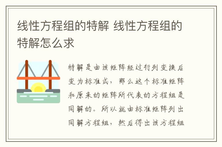 特解是由该矩阵经过行列变换后变为标准式,那么这个标准矩阵和原来的矩阵所代表的方程组是同解的。所以就由标准矩阵列出同解方程组,然后得出该方程组特解。具体解法为:(1)将原增广矩阵行列变换为标准矩阵。(2)根据标准行列式写出同解方程组。(3)按列解出方程。(4)得出特解。