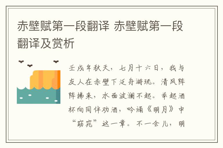 此赋记叙了作者与朋友们月夜泛舟游赤壁的所见所感,以作者的主观感受为线索,通过主客问答的形式,反映了作者由月夜泛舟的舒畅,到怀古伤今的悲咽,再到精神解脱的达观。