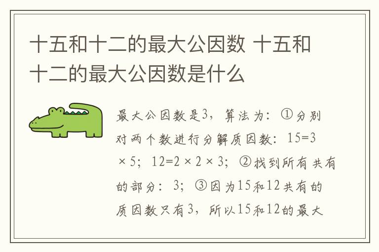 十五和十二的最大公因数 十五和十二的最大公因数是什么 知识分享 23年2月10日 编辑 童画 取消关注 关注 私信 15和12的最大公因数是3,算法为: ①分别对两个数进行分解质因数: 15=3×5; 12=2×2×3; ②找到所有共有的部分:3; ③因为15和12共有的质因数只有3,所以15和12的最大公因数是3。 No related posts. 本文内容由互联网用户自发贡献,该文观点仅代表作者本人。本站仅提供信息存储空间服务,不拥有所有权,不承担相关法律责任。如发现本站有涉嫌抄袭侵权/违法违规的内容, 请发送邮件至 2245678901@qq.com 举报,一经查实,本站将立刻删除。 给TA打赏 共{{data.count}}人 人已打赏