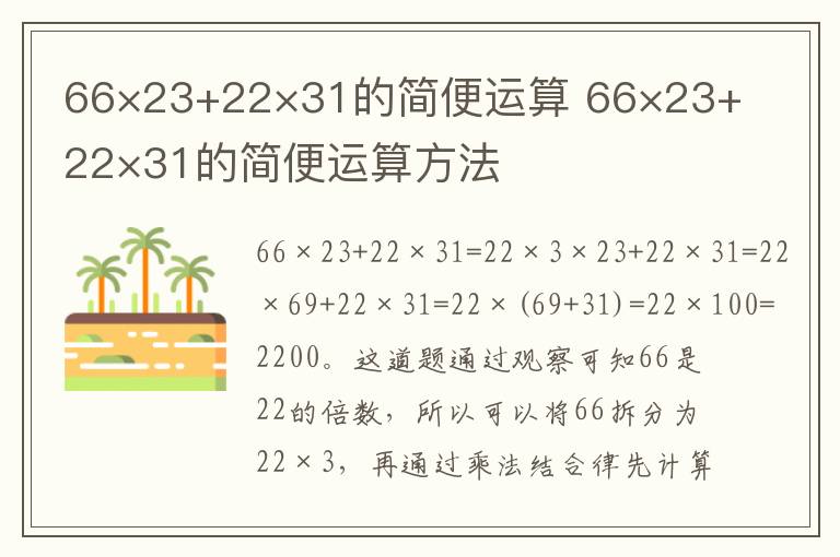 这道题通过观察可知66是22的倍数,所以可以将66拆分为22×3,再通过乘法结合律先计算3×23,最后通过乘法结合律得到22×(69+31)=22×100,可以简化计算过程。