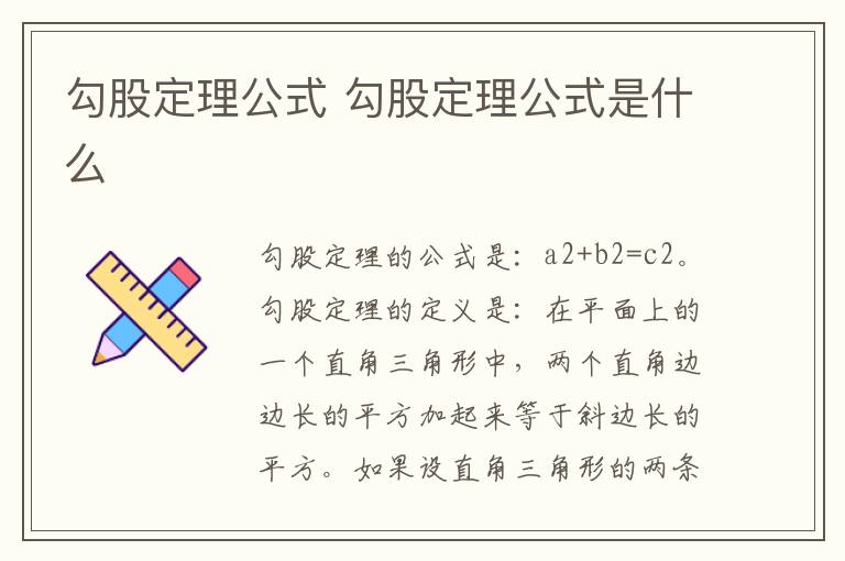 勾股定理的公式为a2+b2=c2,在平面上的一个直角三角形中,两个直角边边长的平方加起来等于斜边长的平方。如果设直角三角形的两条直角边长度分别是a和b,斜边长度是c,那么则可以用勾股定理来表达。