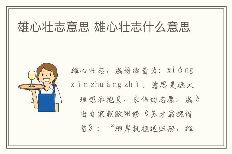 雄心壮志,成语读音为:xióng xīn zhuàng zhì。意思是远大的理想和抱负,宏伟的志愿。