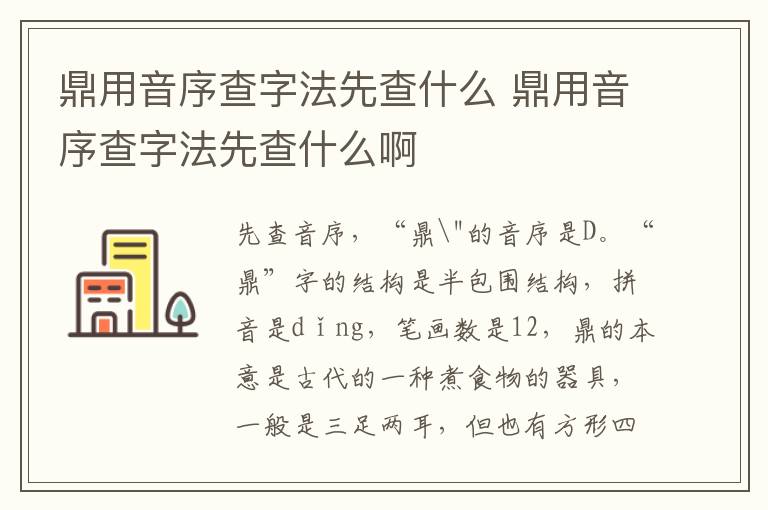 鼎用音序查字法先查什么 鼎用音序查字法先查什么啊 知识分享 23年2月10日 编辑 童画 取消关注 关注 私信 “鼎”用音序查字法先查音序,“鼎"的音序是D。 “鼎”字的结构是半包围结构,拼音是dǐng,笔画数是12,鼎的本意是古代的一种煮食物的器具,一般是三足两耳,但也有方形四足的。 No related posts. 本文内容由互联网用户自发贡献,该文观点仅代表作者本人。本站仅提供信息存储空间服务,不拥有所有权,不承担相关法律责任。如发现本站有涉嫌抄袭侵权/违法违规的内容, 请发送邮件至 2245678901@qq.com 举报,一经查实,本站将立刻删除。 给TA打赏 共{{data.count}}人 人已打赏