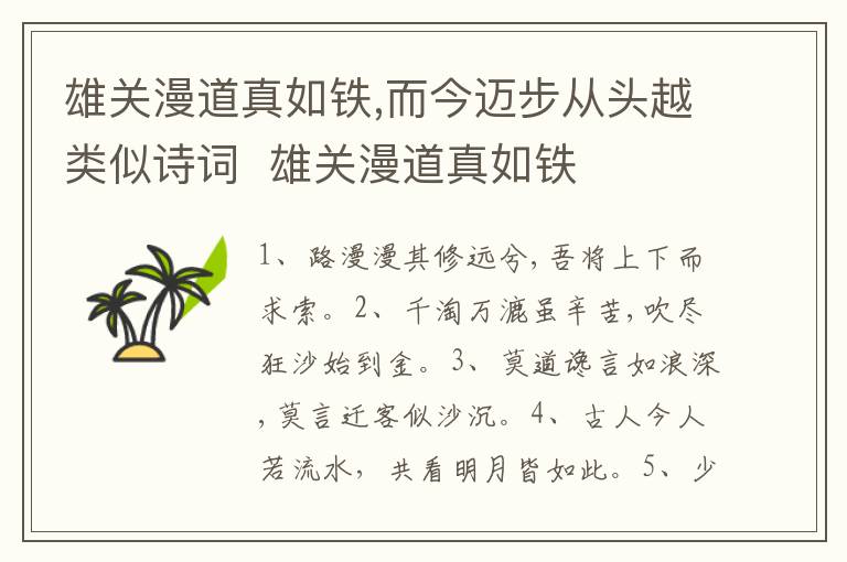 1、路漫漫其修远兮,吾将上下而求索。2、千淘万漉虽辛苦,吹尽狂沙始到金。3、莫道谗言如浪深,莫言迁客似沙沉。4、古人今人若流水,共看明月皆如此。5、少小虽非投笔吏,论功还欲请长缨。6、一年两度锦城游,前值东风后值秋。