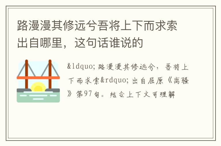 “路漫漫其修远兮,吾将上下而求索”出自屈原《离骚》第97句。结合上下文可理解为:道路又窄又长无边无际,我要努力寻找心中的太阳。表达了屈原“趁天未全黑探路前行”的积极求进心态。