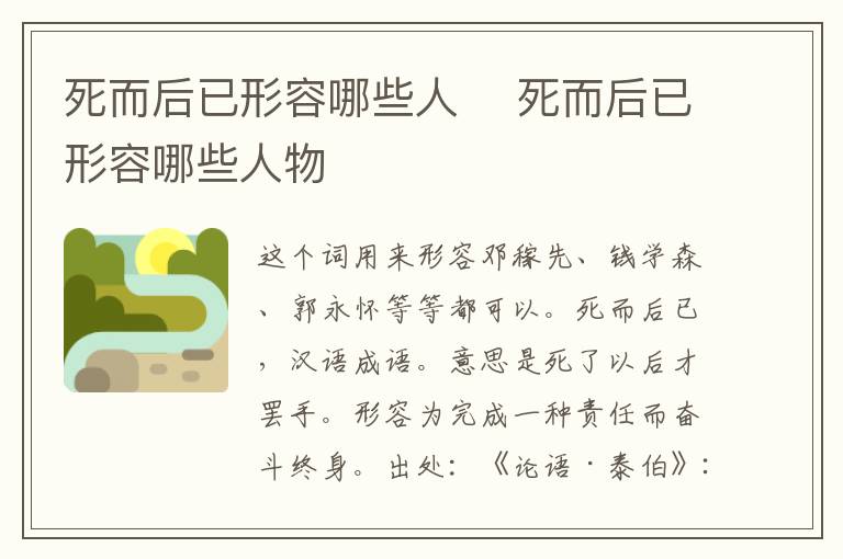 这个词用来形容邓稼先、钱学森、郭永怀等等都可以。死而后已,汉语成语。意思是死了以后才罢手。形容为完成一种责任而奋斗终身。出处:《论语·泰伯》:“士不可以不弘毅,任重而道远。仁以为己任,不亦重乎?死而后已,不亦远乎?”死而后已的近义词:鞠躬尽瘁全心全意摩顶放踵鞠躬尽力。