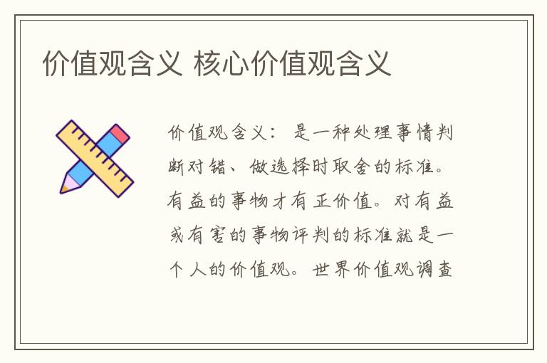 价值观含义:是一种处理事情判断对错、做选择时取舍的标准。有益的事物才有正价值。对有益或有害的事物评判的标准就是一个人的价值观。世界价值观调查,监控和分析:民主,对外国人和少数民族的宽容,对两性平等的支持,宗教的作用和宗教的变化水平的支持,全球化的影响,对环境的态度,工作,家庭,政治,民族认同,文化,多样性,不安全感和主观幸福感。价值观也可以说是一种深藏于内心的准绳,在面临抉择时的一项依据。
