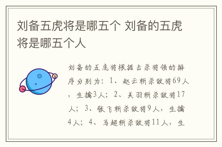 刘备的五虎将根据击杀将领的排序分别为:1、赵云斩杀敌将69人,生擒3人;2、关羽斩杀敌将17人;3、张飞斩杀敌将9人,生擒4人;4、马超斩杀敌将11人,生擒1人;5、黄忠斩杀敌将3人,生擒1人。陈寿最早作《三国志》时,将五人并列合为一传。