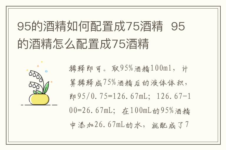 95%的酒精配置成75%酒精过程:稀释即可。例如取100mL95%酒精,95/0.75=126.67,需要加26.67mL的水,就配成了75%度酒精。酒精稀释,就是把高浓度的(95%)酒精(有500毫升包装的、95%酒精),加一定体积水后,配制成低浓度的(例如75%)酒精的过程。