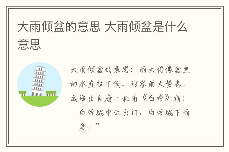 大雨倾盆的意思 大雨倾盆是什么意思 知识分享 23年2月10日 编辑 童画 取消关注 关注 私信 【读音】 dà yǔ qīng pén 【释义】 雨大得像盆里的水直往下倒。形容雨大势急。 【出处】 唐·杜甫《白帝》诗:“白帝城中云出门,白帝城下雨翻盆。” 【近义词】倾盆大雨 瓢泼大雨 大雨滂沱 【反义词】牛毛细雨 和风细雨 蒙蒙细雨 【例句】 南方的天气,一会儿太阳普照,一会儿又是大雨倾盆。 No related posts. 本文内容由互联网用户自发贡献,该文观点仅代表作者本人。本站仅提供信息存储空间服务,不拥有所有权,不承担相关法律责任。如发现本站有涉嫌抄袭侵权/违法违规的内容, 请发送邮件至 2245678901@qq.com 举报,一经查实,本站将立刻删除。 给TA打赏 共{{data.count}}人 人已打赏