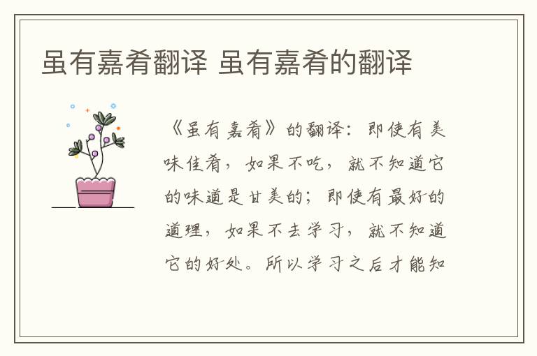 《虽有嘉肴》的翻译:即使有美味佳肴,如果不吃,就不知道它的味道是甘美的;即使有最好的道理,如果不去学习,就不知道它的好处。所以学习之后才能知道自己的不足之处,教导他人之后才能知道自己的困惑。知道自己不足之处,这样以后能够反省自己;知道自己困惑的地方,这样以后才能自我勉励。所以说教与学是互相促进的。教别人,也能增长自己的学问。《兑命》上说:“教人是学的一半。”大概说的就是这个道理吧?