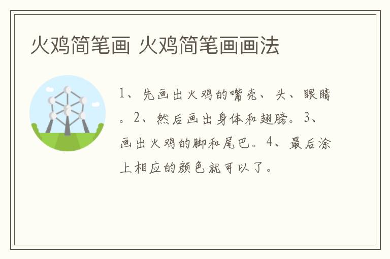 火鸡简笔画 火鸡简笔画画法 知识分享 23年2月10日 编辑 童画 取消关注 关注 私信 1、先画出火鸡的嘴壳、头、眼睛。 2、然后画出身体和翅膀。 3、画出火鸡的脚和尾巴。 4、最后涂上相应的颜色就可以了。 No related posts. 本文内容由互联网用户自发贡献,该文观点仅代表作者本人。本站仅提供信息存储空间服务,不拥有所有权,不承担相关法律责任。如发现本站有涉嫌抄袭侵权/违法违规的内容, 请发送邮件至 2245678901@qq.com 举报,一经查实,本站将立刻删除。 给TA打赏 共{{data.count}}人 人已打赏